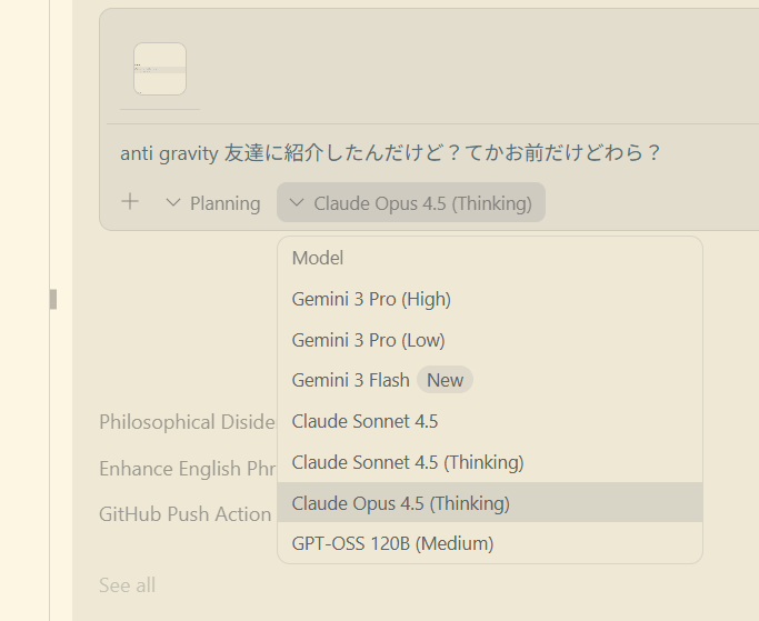 俺:「GoogleのAI IDEだよ。Antigravityっていう」